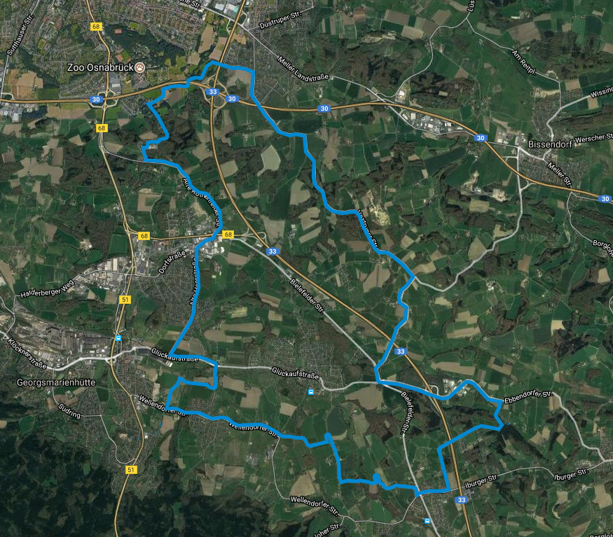 Starten wollte ich mit der „Ostzone“ also Wellendorf als erstes Ziel. Danach – nun ja, mal sehen. Irgendwie nach Norden Richtung Eistrup oder Voxtrup. Dank zweimal falsch entschieden kam ich dann doch wieder auf Kloster Ösede zu – das war mir zu kurz, also ab Richtung Holsten-Mündrup und dann nach Voxtrup. So konnte ich wenigstens nochmal Alternativrouten über Harderberg ausprobieren, ohne dass man an die B51 muss.